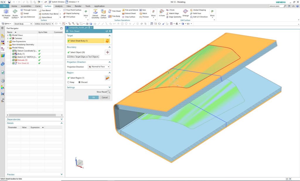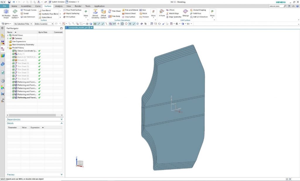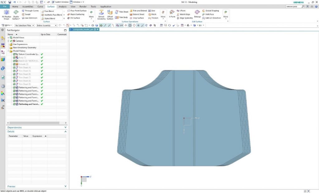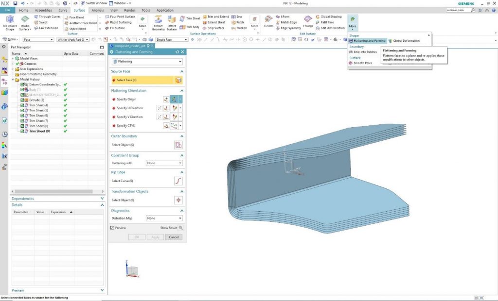 These surfaces can be flattened by using the “Flattening and Forming” command. In this way, the shape, size of the cross-sections and exact cut pattern of the mesh is provided. Run the command and in the “Source Face” it is needed to select the interface to be flattened.