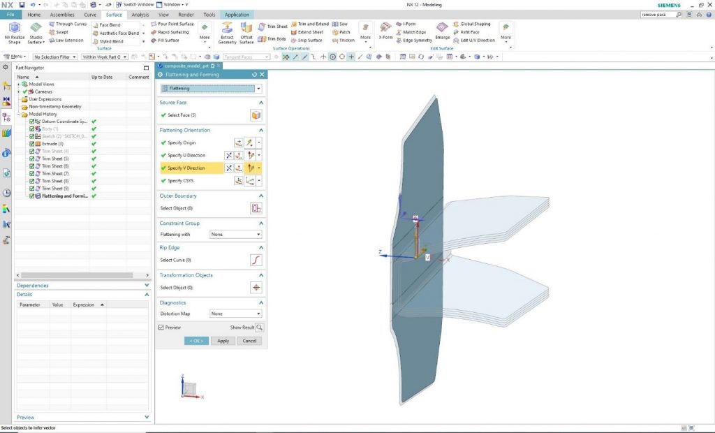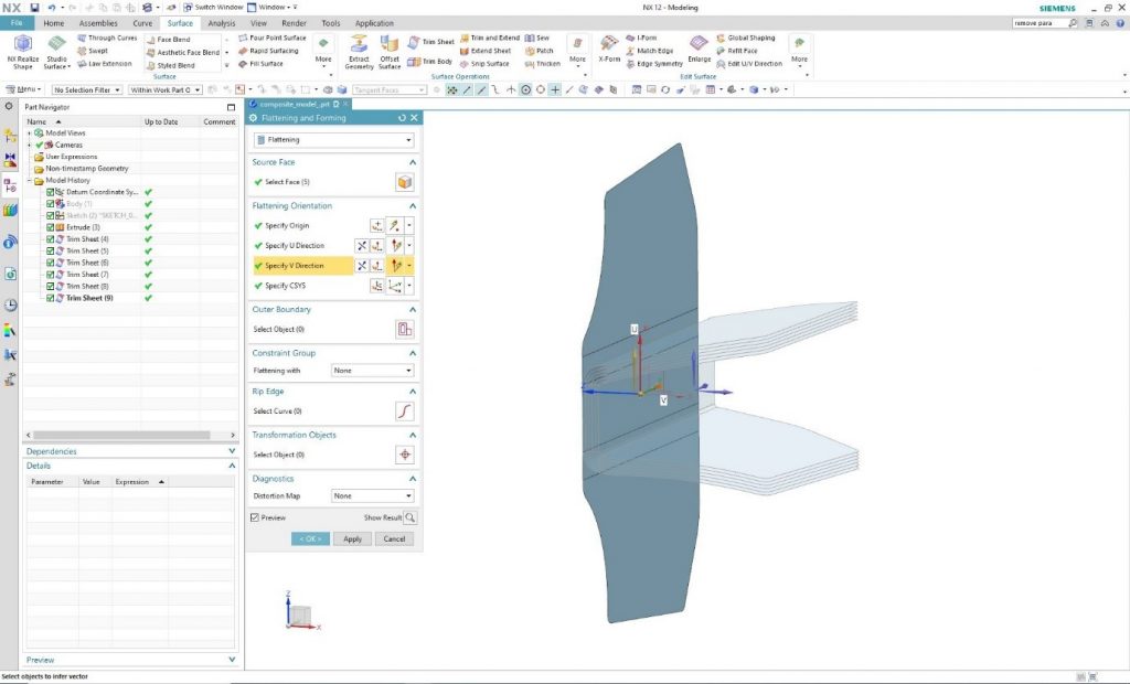 Specifying the coordinate system in which the program will spread the surface is possible under the “Flattening Orientation” tab. By clicking on one of the selected surfaces, the program automatically generates the coordinate system, the required origin, and the U and V direction. Of course, it is possible to deviate from this by individually defining components.