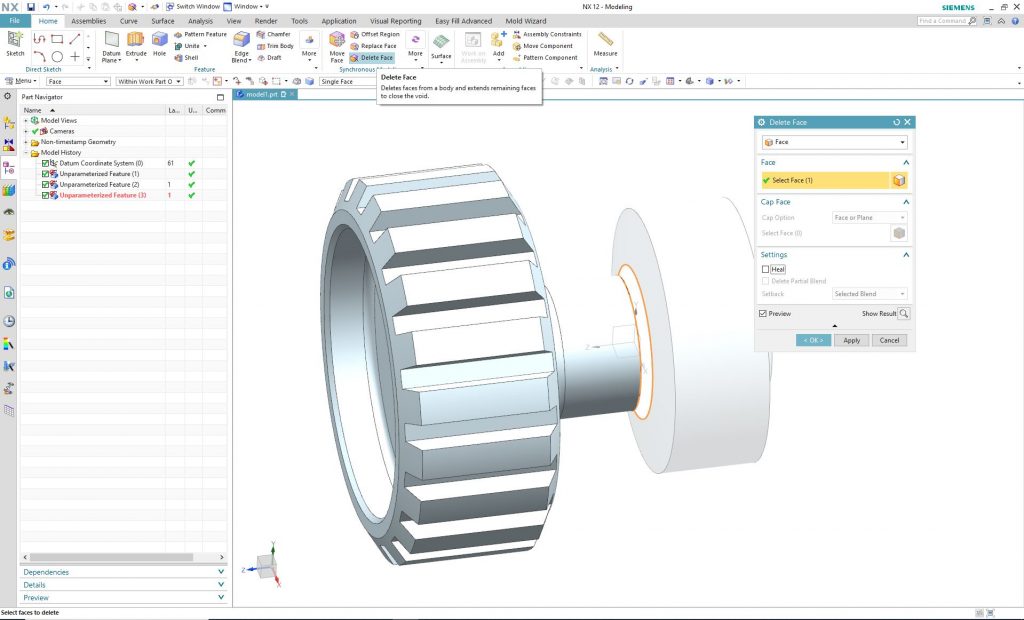 Ezt a lekerekítést le kell törölnünk, és újra fel kell rakni. Legegyszerűbben a „Delete Face” szikron paranccsal tudjuk megtenni, amit konvertált modell révén nyugodtan alkalmazhatunk.