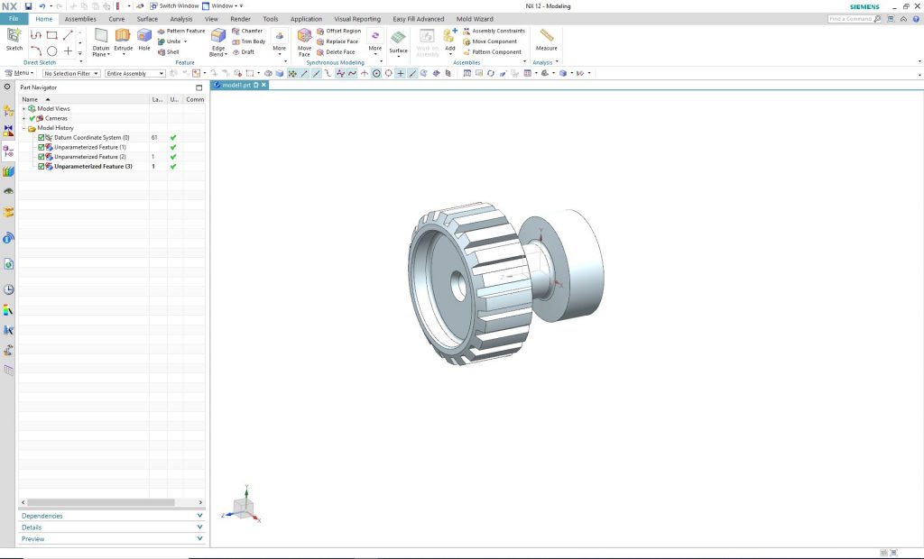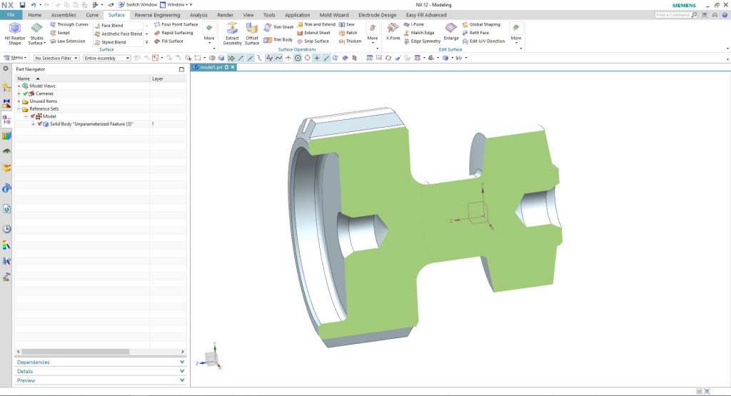Mihelyt zárttá válik a felület, az NX automatikusan testet képez belőle, amit metszetben és a fában is láthatunk.