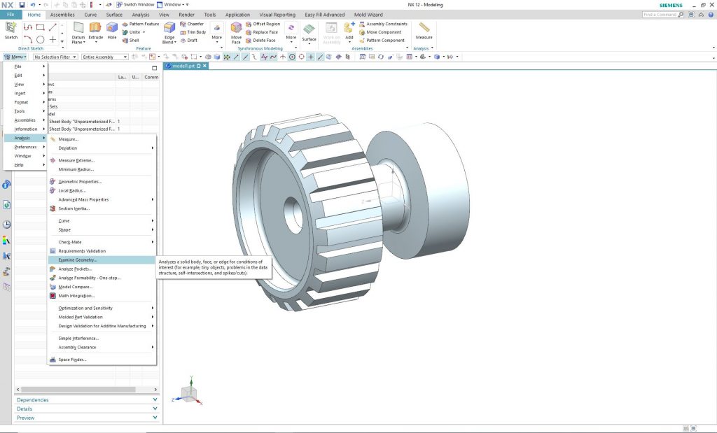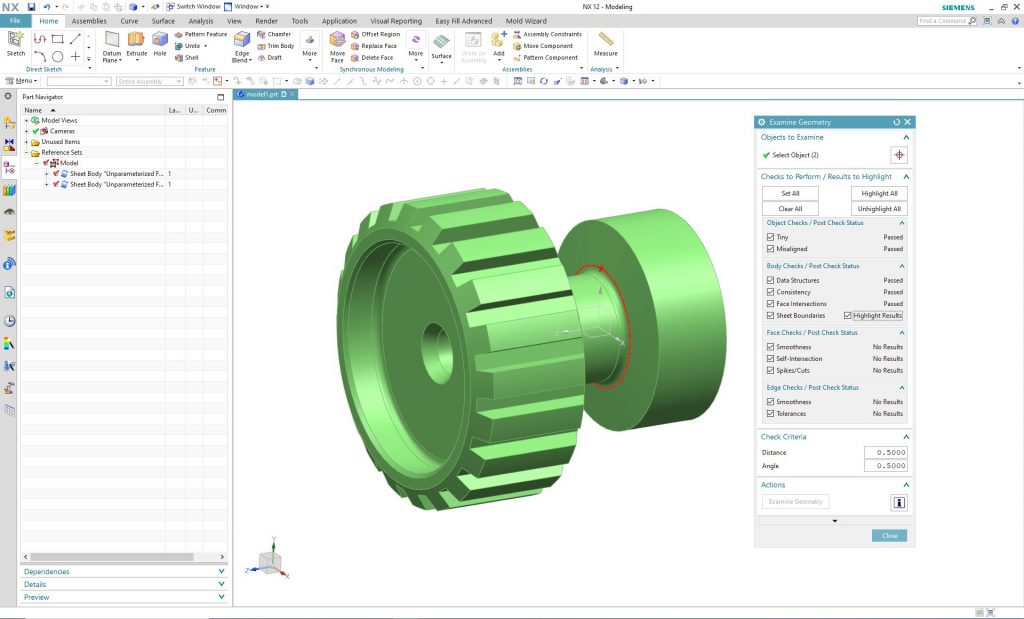 Abban az esetben ha „sheet body”-ként épül fel a befordított modell, és nem találjuk a hiba okát, akkor NX-ben az „Examine Geometry” parancs segítségével ki tudjuk jelöltetni a hiba okát.