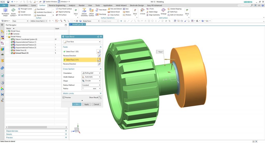 Majd a „Face Blend” paranccsal egyszerűen vissza tudjuk rakni a szükséges 1 mm-es rádiuszt kettő felület közé.